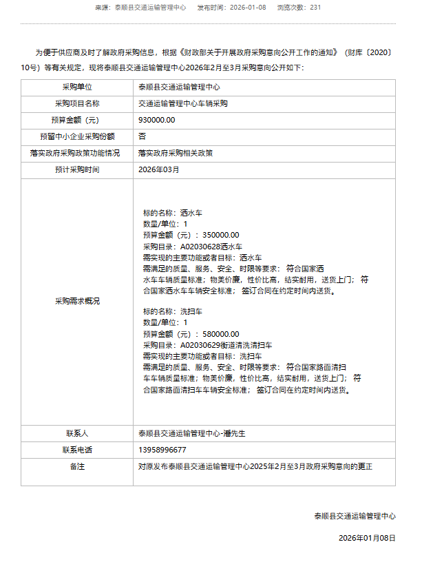 [采购意向公开]泰顺县交通运输管理中心2026年2月至3月政府采购意向