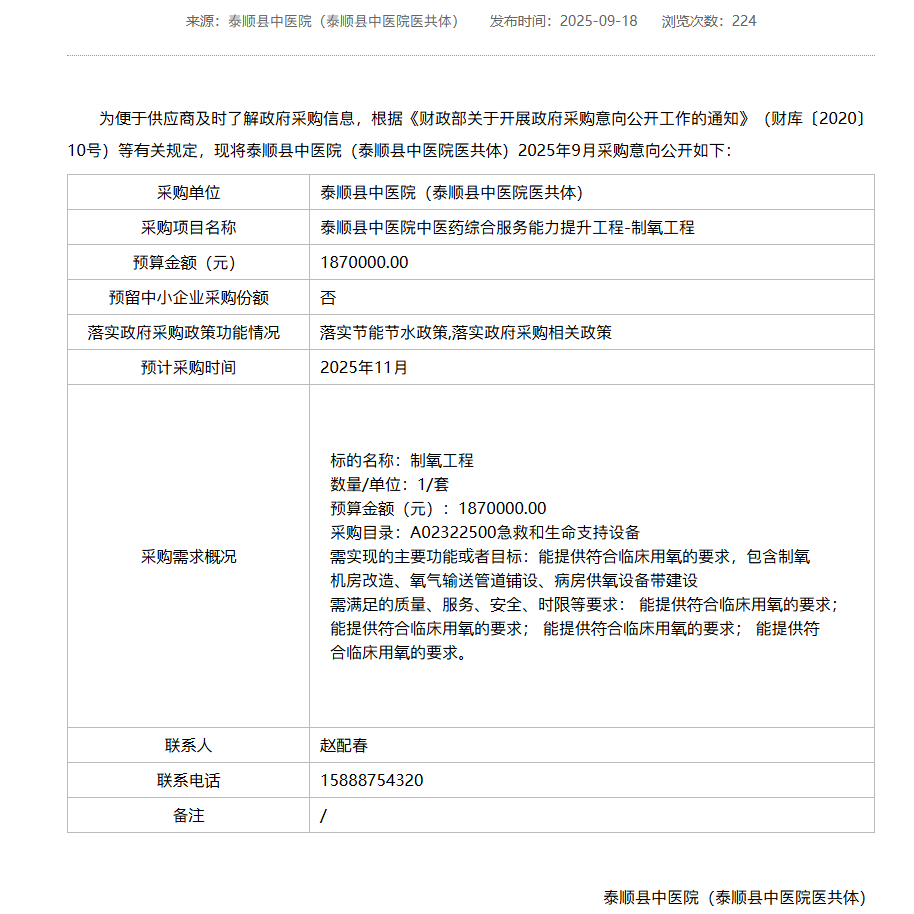 [采购意向公开]泰顺县中医院中医药综合服务能力提升工程-制氧工程