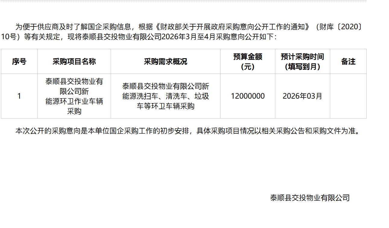 [采购意向公开]泰顺县交投物业有限公司2026年3月至4月国企采购意向