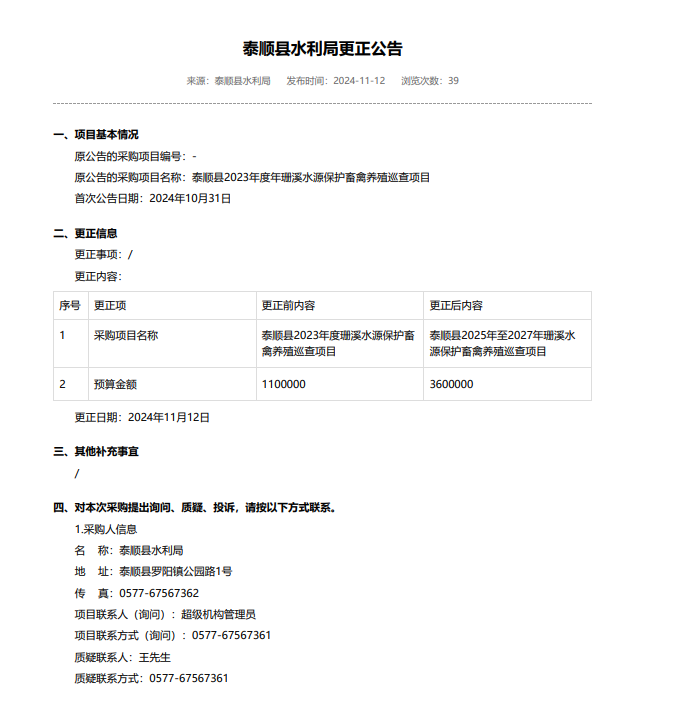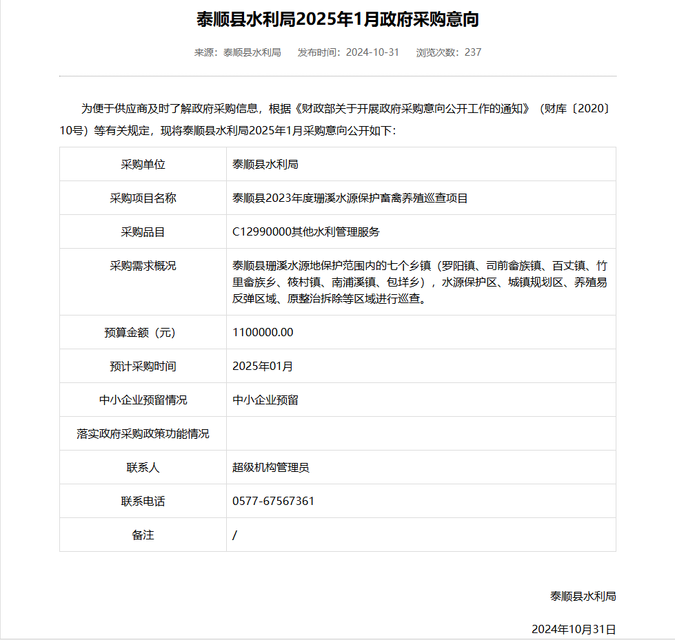 [采购意向公开]泰顺县水利局2025年1月政府采购意向