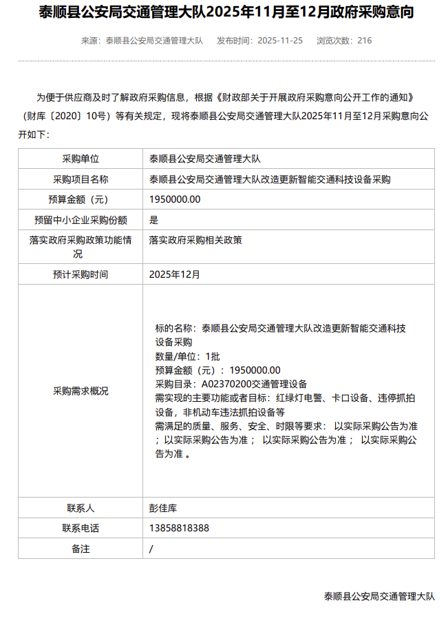 [采购意向公开]泰顺县公安局交通管理大队2025年11月至12月政府采购意向