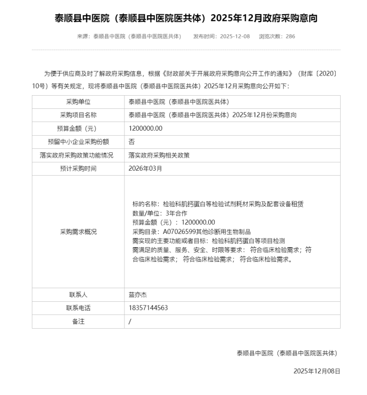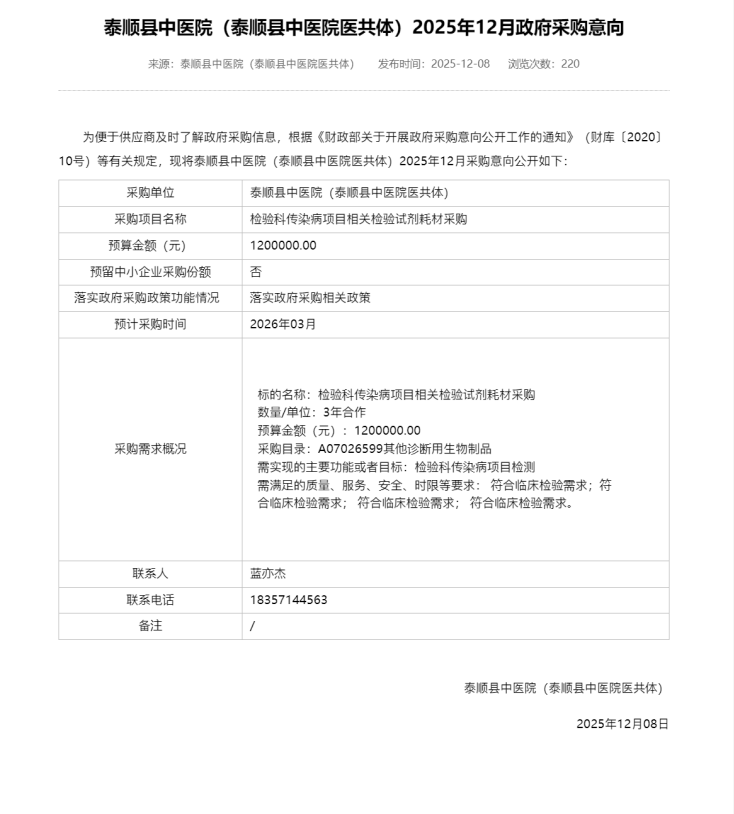 [采购意向公开]泰顺县中医院(泰顺县中医院医共体)2025年12月政府采购意向