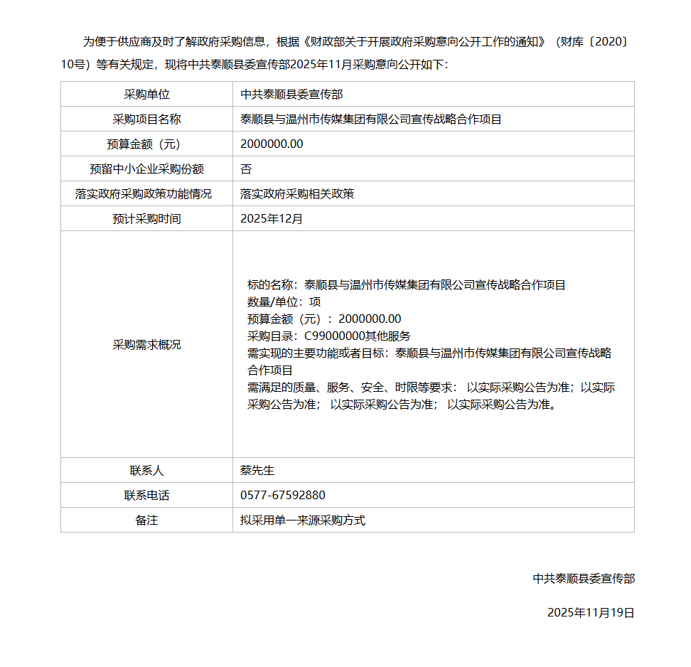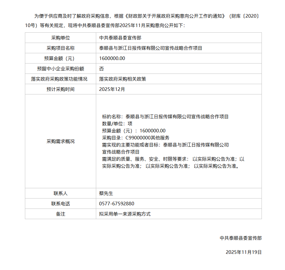 [采购意向公开]中共泰顺县委宣传部2025年11月政府采购意向