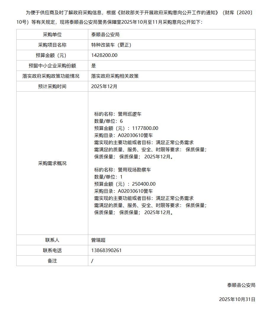 [采购意向公开]泰顺县公安局警务保障室2025年10月至11月政府采购意向