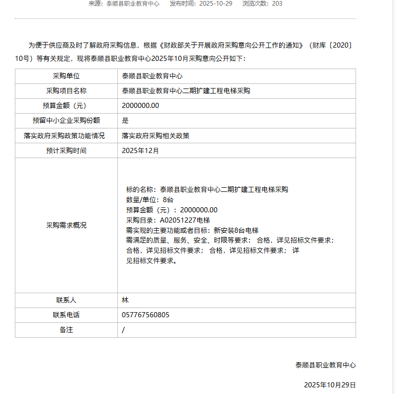 [采购意向公开]泰顺县职业教育中心2025年10月政府采购意向